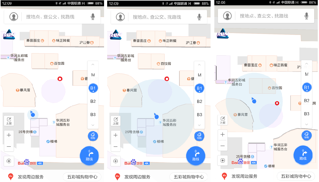 然而,后來(lái)一切進(jìn)展的并不順利。到現(xiàn)在2016年下半年已經(jīng)有幾年時(shí)間過(guò)去了,室內(nèi)定位應(yīng)用似乎并沒(méi)有走進(jìn)大家的生活。手機(jī)地圖APP在大型購(gòu)物中心里還是不好用,人們?cè)谕\噲?chǎng)依然要費(fèi)勁才能找到自己的車。近日,筆者在北京IT公司聚集地附近的清河華潤(rùn)五彩城購(gòu)物中心實(shí)地測(cè)試室內(nèi)定位的效果。用Android手機(jī)打開百度地圖APP進(jìn)行室內(nèi)定位測(cè)試,下圖是筆者在同一點(diǎn)(紅圈)進(jìn)行三次定位得到的結(jié)果(藍(lán)圈范圍),可以看到定位結(jié)果很不穩(wěn)定,甚至?xí)r常會(huì)把我定位到購(gòu)物中心的外面。換成高德地圖(被阿里收購(gòu))、騰訊地圖,換成其它購(gòu)物中心,效果都類似。用IOS手機(jī)則定位效果更差(原因后文會(huì)講)。定位不穩(wěn)定、結(jié)果不可信,造成室內(nèi)定位應(yīng)用不能進(jìn)入大眾生活,相關(guān)生態(tài)也無(wú)法建立。筆者覺(jué)得這里恰好隱藏著很大的機(jī)會(huì)。