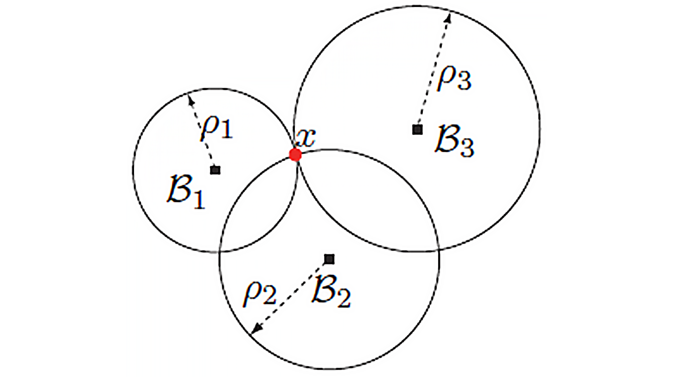 已知待定位終端(如手機(jī))分別到n個(gè)已知位置的基站(如固定在室內(nèi)屋角)距離,那么分別以每個(gè)基站為圓心,以終端到該基站距離為半徑,可畫出n個(gè)圓,這n個(gè)圓的交點(diǎn)位置就是手機(jī)的位置。n為3可以定出終端在二維平面上的位置;n為4可定出基站在三維空間的位置。這就是三邊定位的基本原理,如下圖所示。