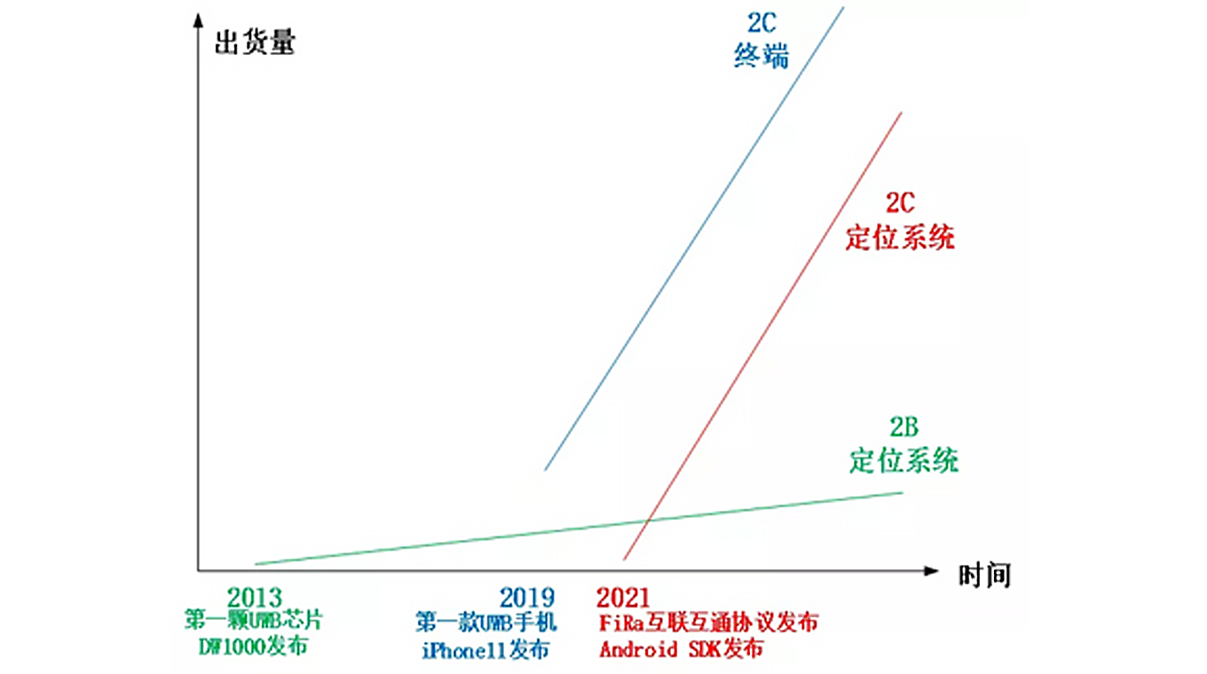很多人說:新機會產生在行業變革期,UWB行業此刻就在發生大變革。從13年愛爾蘭Decawave(20年初被Qorvo收購)發布第一顆UWB芯片DW1000開始,很多公司基于該芯片做自己的UWB定位系統;與大多數B端行業類似,UWB行業整體是平緩上升的曲線(圖中綠色線),是做項目的模式,不被大多數投資機構看好。