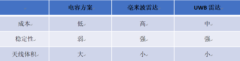毫米波雷達是一種備選替代方案,通過對毫米波雷達回波的分析,可以有效檢測踢腿的動作。并且毫米波不受周邊電磁環境的干擾,雨水的影響也不大。目前車載毫米波腳踢尾箱雷達最大的問題是價格較昂貴(相比電容方案和UWB雷達方案)。UWB雷達提供了另一種選項。穩定性足夠高(相比電容方案),成本適中(比電容方案貴,比毫米波方案便宜),低功耗(低于毫米波雷達)。